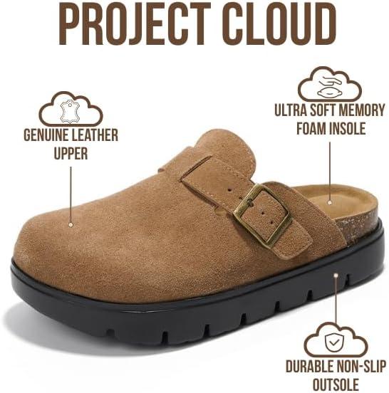 Project Cloud 100% Genuine Leather Platform Clogs for Women Footwear – Memory Foam Arch Support Cork Footbed Casual Shoes & Mules for Women 2026 (Benton Chunky)(Foss Suede)