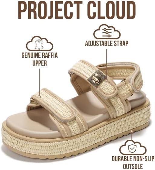 Project Cloud 100% Genuine Leather Platform Sandals Women Footwear - Comfortable Strappy Summer Sandals for Women 2026 - Memory Foam and Non-Slip Beach Slides(High Platform Raffia)