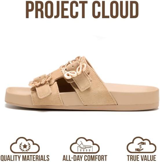 Project Cloud 100% Genuine Leather Womens Sandals Dressy - Lightweight & Non-Slip Women's Flats Sandals Women with Plush & Soft Insole Slides Sandals for Women 2026 (Velora)(Beige Suede)