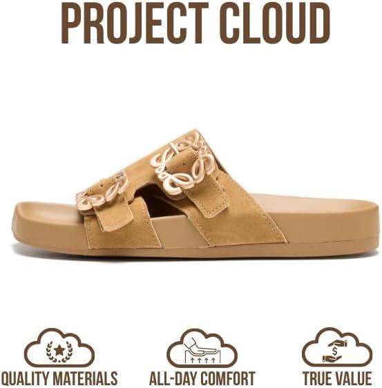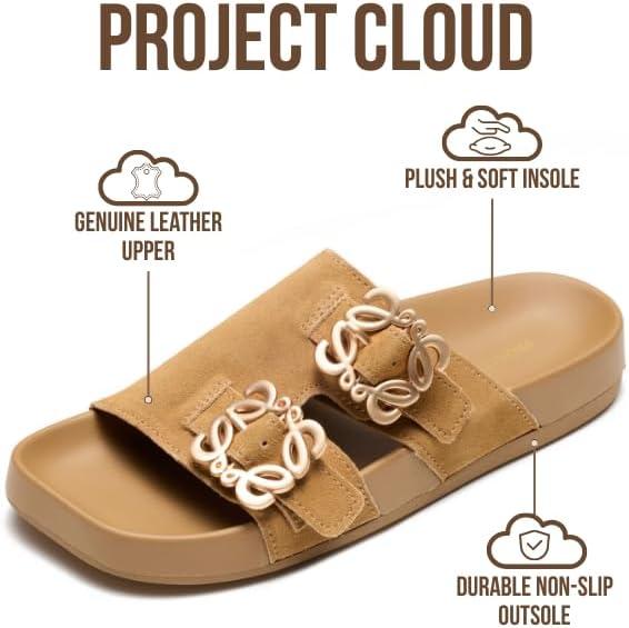 Project Cloud 100% Genuine Leather Womens Sandals Dressy - Lightweight & Non-Slip Women's Flats Sandals Women with Plush & Soft Insole Slides Sandals for Women 2026 (Velora)(Chestnut Suede)