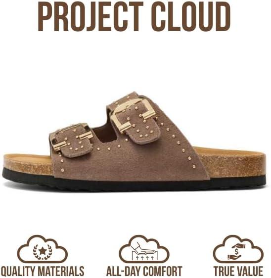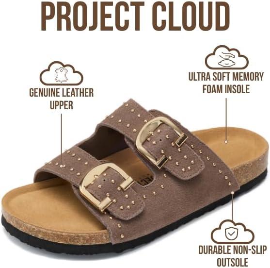 Project Cloud 100% Genuine Leather Womens Sandals - Lightweight Sandals for Women 2026 with Memory Foam Insole & Natural Cork Footbed Beach Essentials Slides for Women Footwear (Venita Stud)(Mushroom)