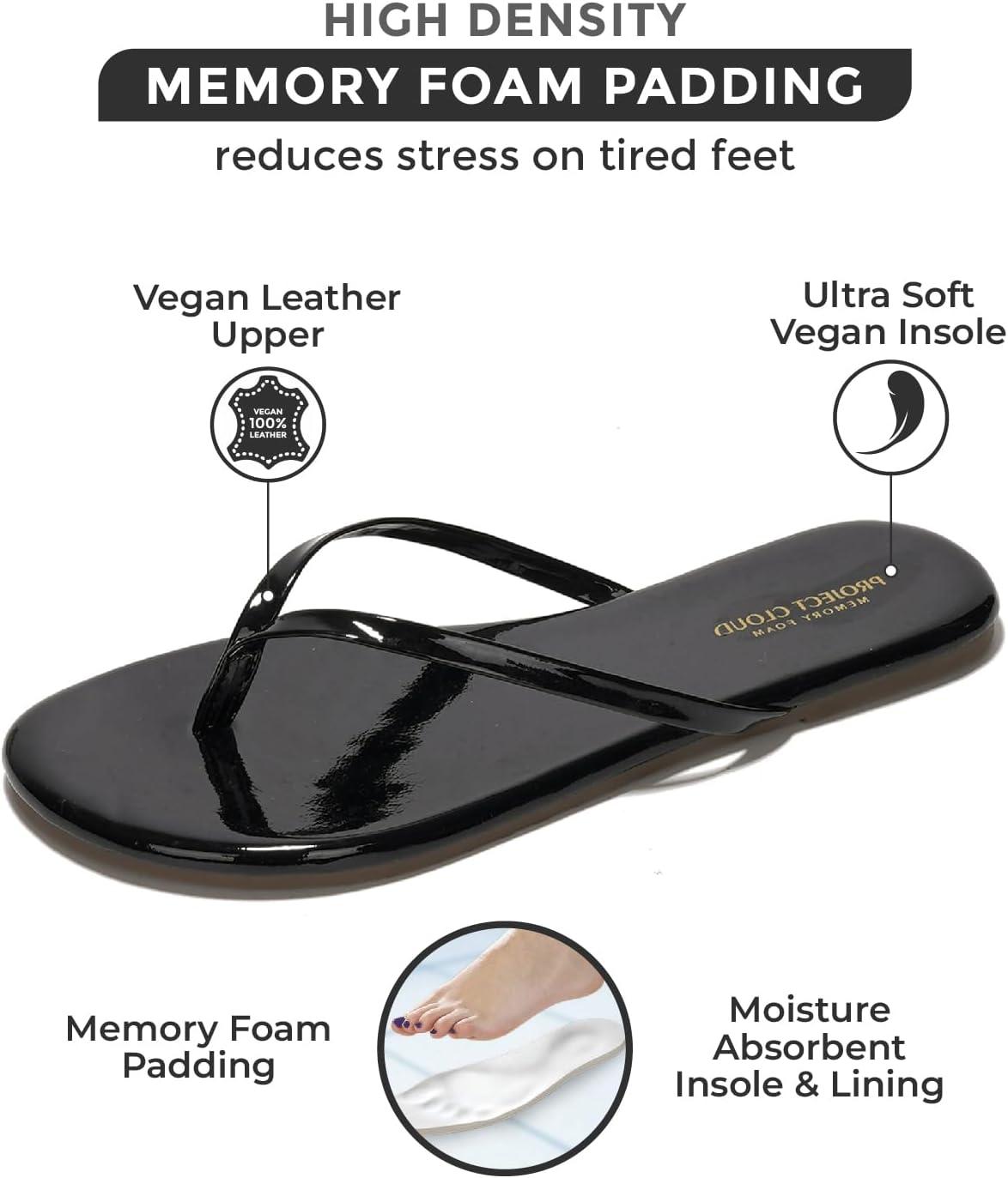 Project Cloud Flip Flops for Women – Memory Foam Flats Summer Sandals for Women 2025 – Vegan Leather Lightweight Womens Sandals Summer Beach Essentials Slides(Black Patent)