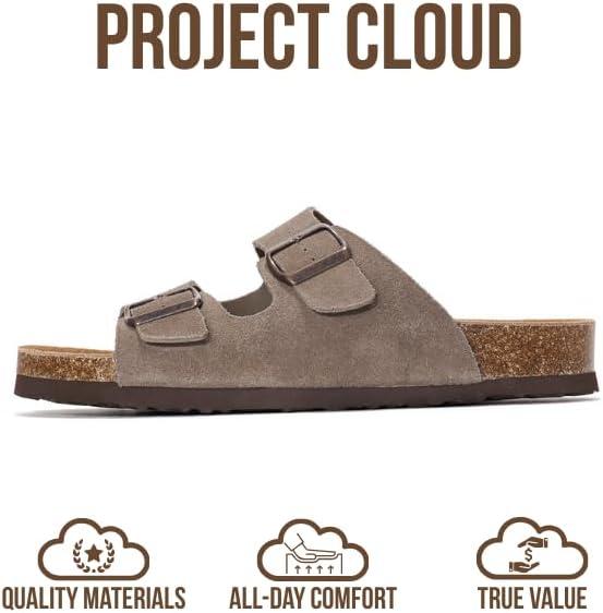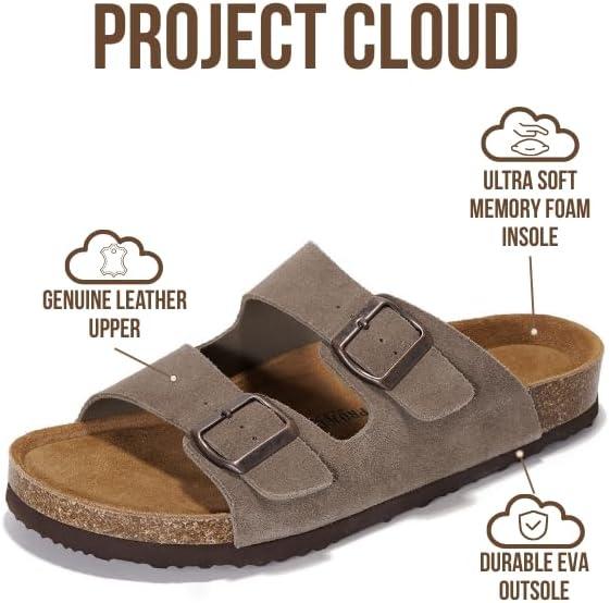 Project Cloud Genuine Leather Mens Sandals with Memory Foam Natural Cork Footbed Slides for Men Footwear - Non-Slip Double-Strap Buckle Summer Sandals (Arizona)(Taupe Suede)