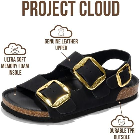 Project Cloud Genuine Leather Summer Sandals for Women 2025 – Memory Foam Slingback Womens Sandals Comfortable and Non Slip Beach Slides with Big Buckle (Garda)(Black)