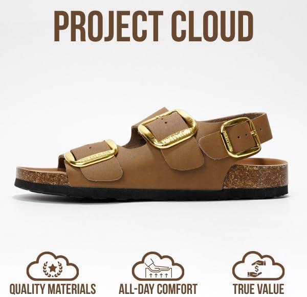 Project Cloud Genuine Leather Summer Sandals for Women 2025 – Memory Foam Slingback Womens Sandals Comfortable and Non Slip Beach Slides with Big Buckle (Garda)(Tan)