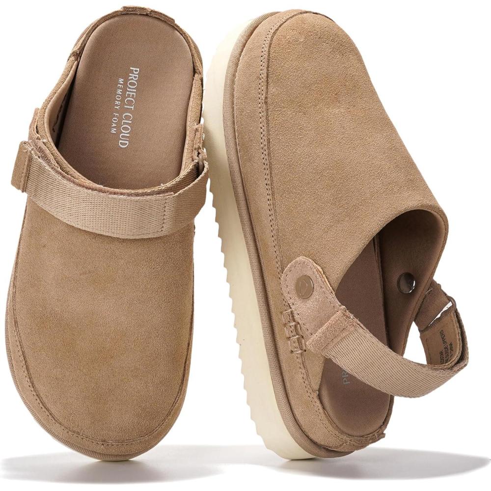 Project Cloud Genuine Suede Clogs for Women - Memory Foam Womens Clogs & Mules with Adjustable Straps - Lightweight Platform Shoes Non-Slip Slides (Goldstar)(Sand Suede)