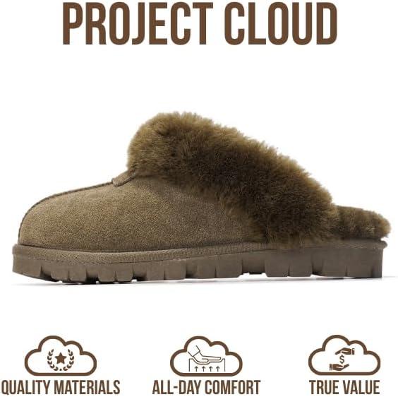 Project Cloud House Slippers for Women – Genuine Leather & Natural Fur Lining Fluffy Slippers – Memory Foam Womens Shoes (Hedy)(Light Grey Suede)