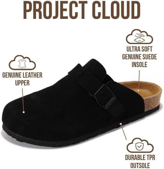 Project Cloud Mens Clogs - 100% Full Grain Genuine Leather Memory Foam Clogs for Men Arch Support Cork Footbed - Non Slip Platform Mules (Brooklyn)(Jet Black Suede)
