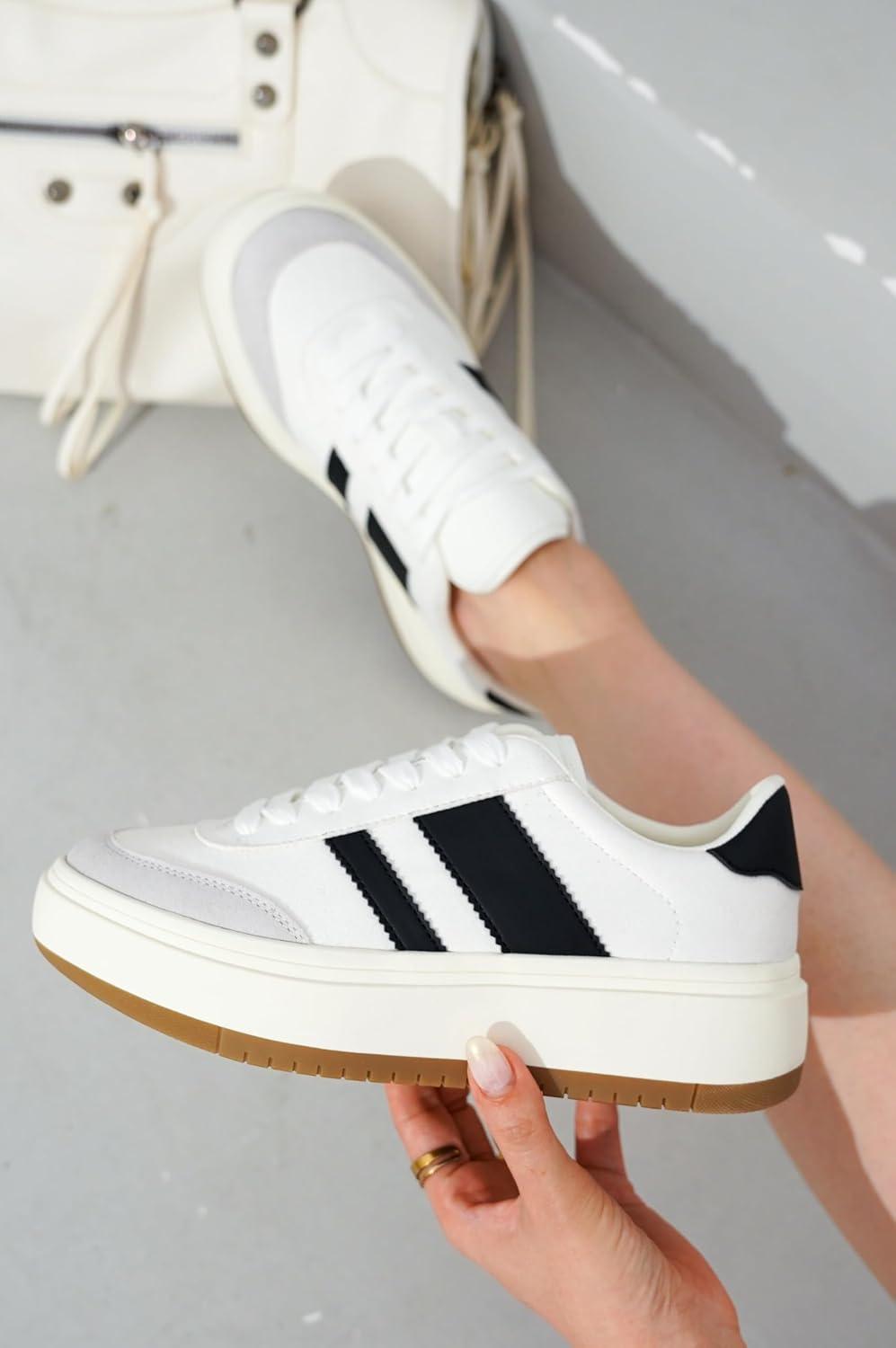 Women’s Lace-Up Fashion Sneakers – Nita by Project Cloud(White-black Stripes)